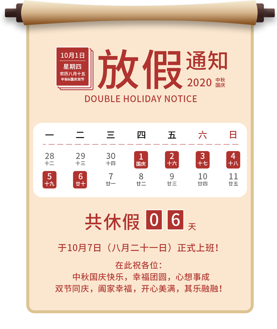 根據《國務院辦公廳關于2020年部分節假日安排》的通知精神,并結合我司實際情況,現將中秋節、國慶節放假時間安排有關事宜通知如下: